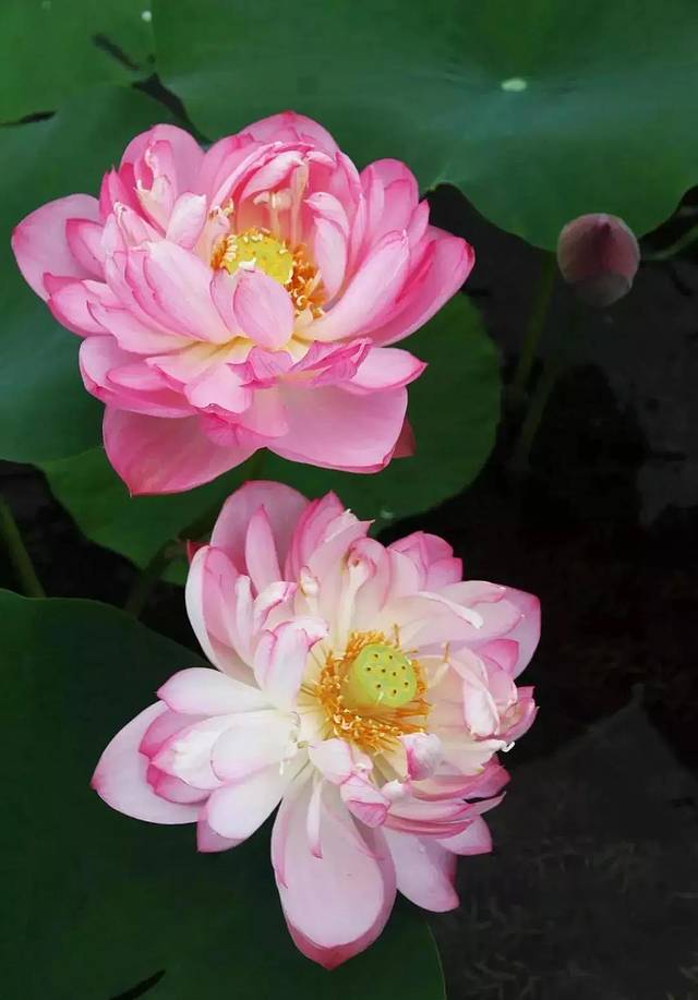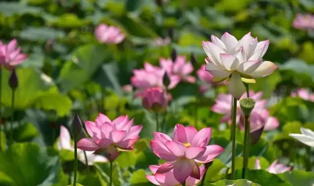 水榭亭台、白墙黛瓦,荷花顺着这些池塘和溪流次第渐开。粉色的荷花则像娇羞的少女一般立在荷叶之上,在阳光的照耀下,花瓣薄如蝉翼,搭配上金黄色的花蕊和嫩黄色的莲蓬,更显婀娜。