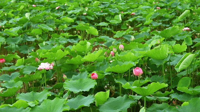 成片成片的翠绿色中,点染着星星点点的粉红、粉白,加上远处的山峰、白云,构成了一幅清新亮丽的图画。荡舟穿行其间,清新淡雅,沁人心脾,犹如炎炎夏日里的一股凉风,更仿佛置身于诗画之中。