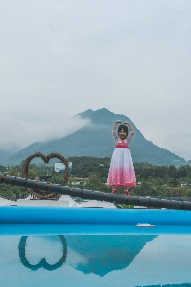 花园里还布置了几个很别致的打卡点,白水寨作背景,早上薄雾萦绕在山腰,有种仙境的感觉。