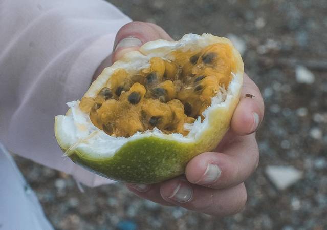 我们还顺道参观了百香果园,女儿好奇地摘下一颗成熟的果实,马上开来吃,这样品尝百香果别有一番滋味。