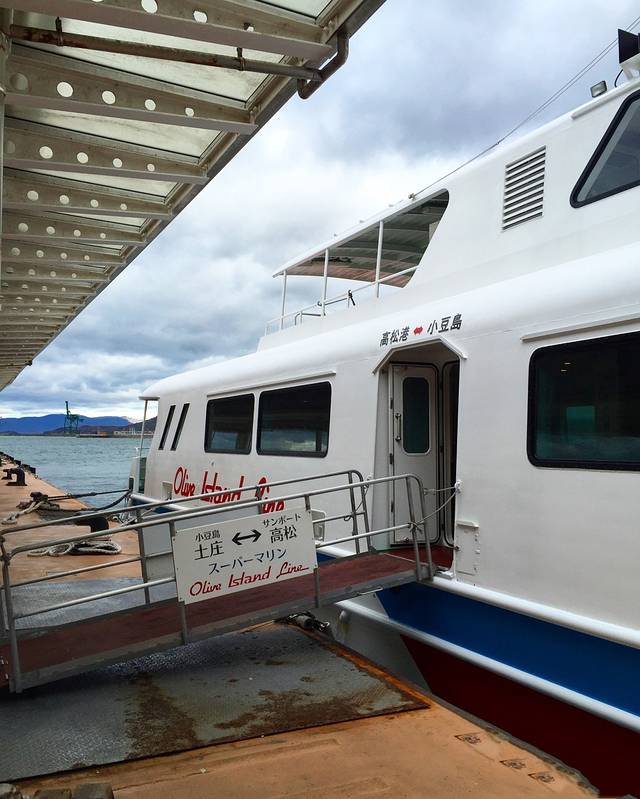 在 高松 港乘坐游船,大概2小时左右便可到达。也有快艇可以搭乘,时间为1小时,在港口购买前往土庄港的船票最为便利。一般巴士站与酒店的接驳车也都集中在港口。港口有部分行李寄存箱,艺术节期间港口特产店柜台也开放了一部分寄存窗口,一日游的朋友可以善加利用,但艺术节期间前来观赏的人十分多,寄存箱数量有限,所以建议早点去存。