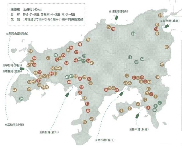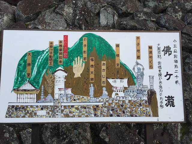 小豆岛上也有八十八灵场一说,网上说是因为 四国 地区有朝圣的文化,如果你看到有人穿着白衣,带着斗笠,拄着拐杖,那些就是参加“遍路”的人。原本朝圣者需沿顺时针方向,绕全岛一圈行走1200公里,方能走完这条连接 四国 88 座寺庙的朝圣之路。这个区间在小豆岛缩小了,但数量不变,应该算迷你版“遍路”吧。据说88个灵场绕小豆岛一圈,全长145km,步行7-8日,自行车4-5日,汽车3-4日可以走完。要那么虔诚地走完,估计我的时间也来不及,就跟着一日游的路线,去了其中之一的第二十番 佛ヶ滝。