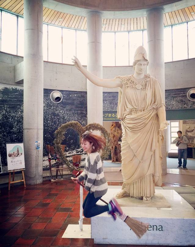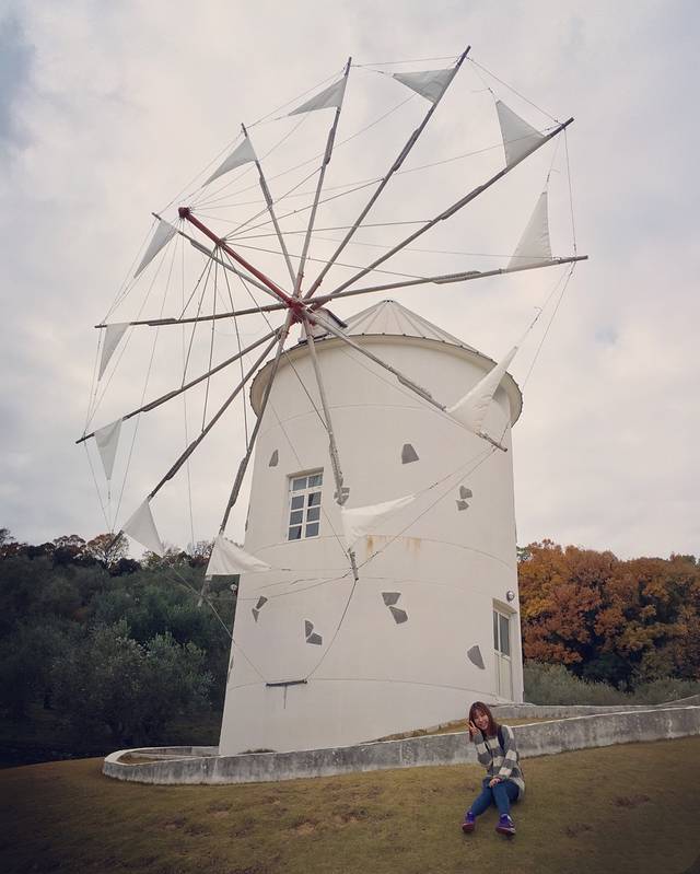 一日游巴士是在主展馆门口停,也是在这里接。主展馆主要卖旅游纪念品和各种橄榄制品,进门的大会堂可以拿免费的扫把和魔女宅急便合影,大会堂中央是橄榄女神(大概)的雕像。除了门向前就是小豆岛标志建筑之一,白色的大风车,这里是拍照圣地,好像到此一游的朋友都不会错过和它合影。