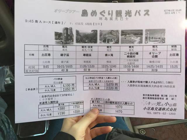 参加这个团只需要在小码头,特产店的旁边报名就可以了。整个行程的时间和安排是:土庄港9:45発 → 銚子渓おさるの国 → 寒霞渓山頂(昼食) → 小豆島八十八ヶ所霊場第二十番 佛ヶ滝 → 二十四の瞳映画村 → オリーブ公園 → (銀波浦経由) → 土庄港15:25着。发车地点也在小码头,报名处附近。我参加的a套餐价格是4100日元,其它信息大家看图。