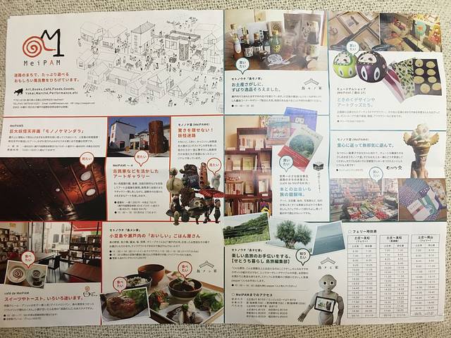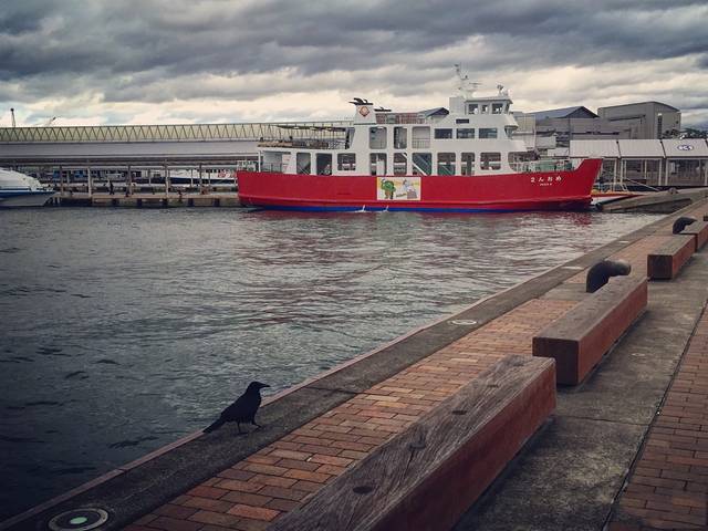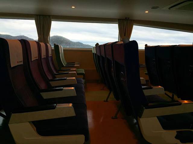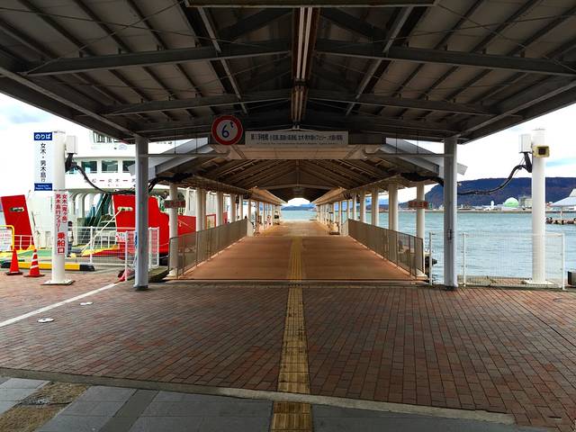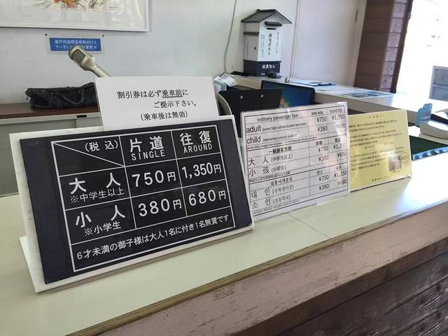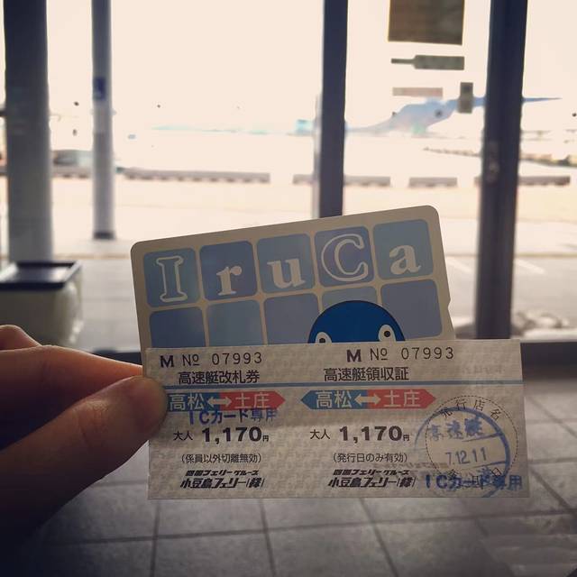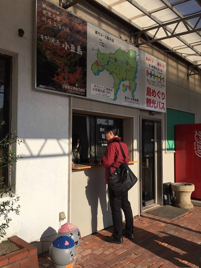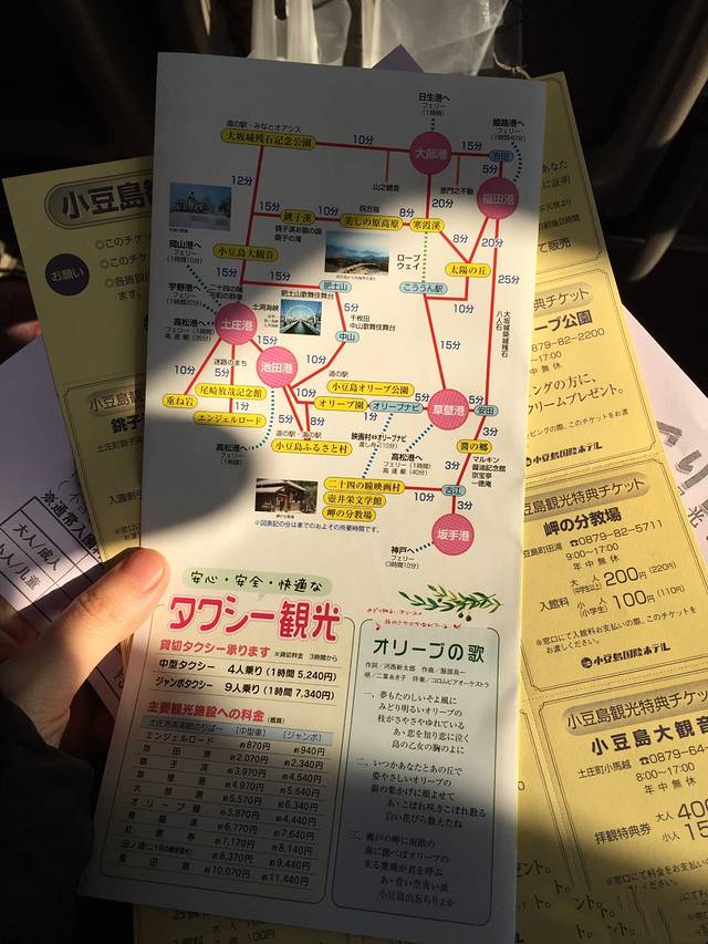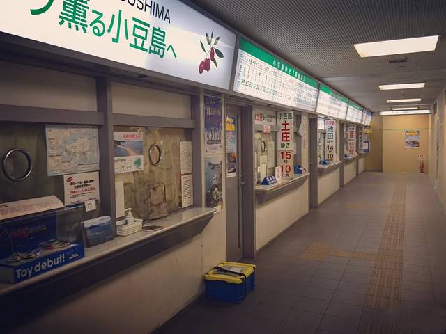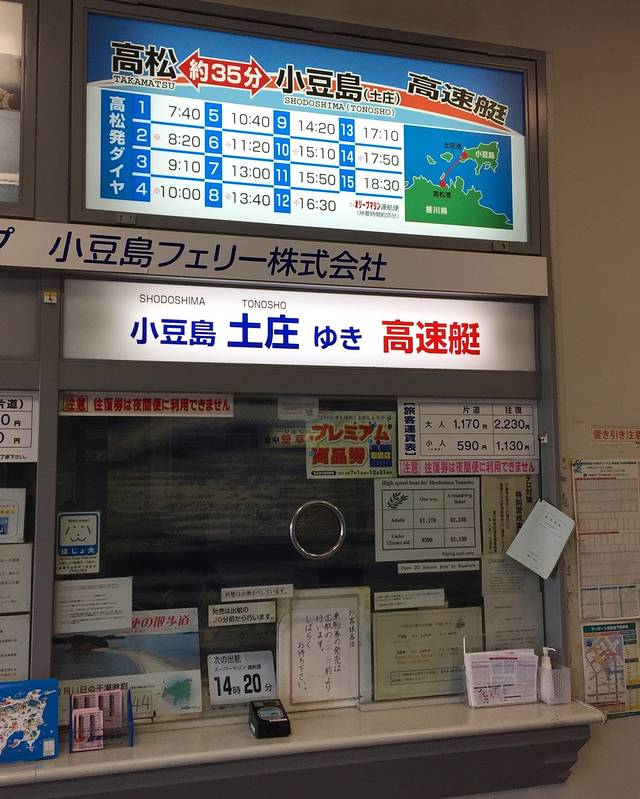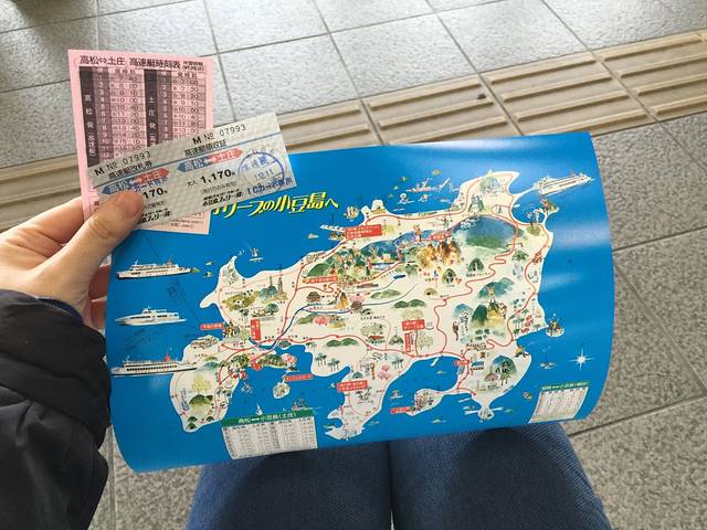我坐的是快艇,单程成人是1170日币,时间约为1小时。回来的时候坐了大的轮船,时间约2小时,价格为690日币,可以直接在机器上买,也支持海豚卡(在上一篇 高松 中有详细介绍)。买完票,旁边有船的时刻表和小豆岛的介绍地图,可以做旅途参考,另外还有岛上的购物打折券(可以打九折哦)。一般窗口在开船前15分钟开始售票,买完票后就去指定展台等船就行了。
