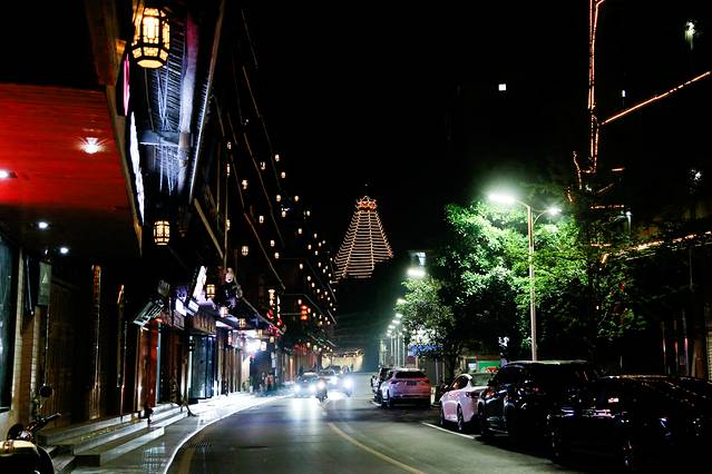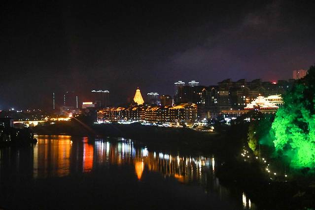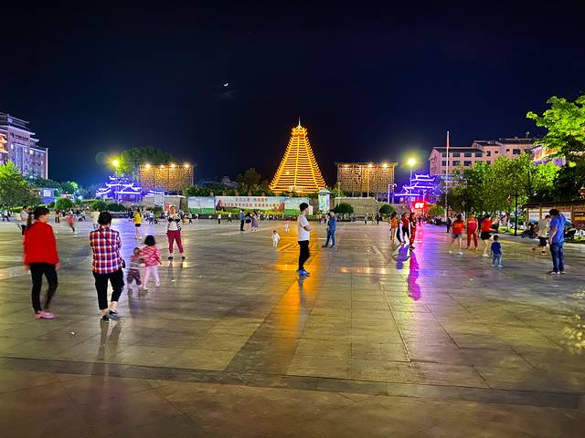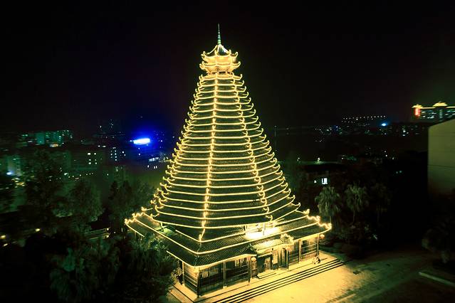 多耶广场与侗乡鸟巢相对而视,这里有许多老年人跳着广场舞,时髦的年轻人聚集玩着滑板,鼓楼、广场灯火通明,鼓楼更是当地的标志建筑,闪耀着它的光芒。