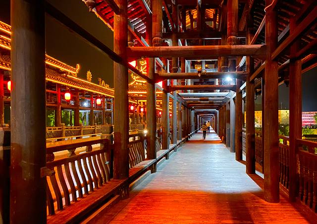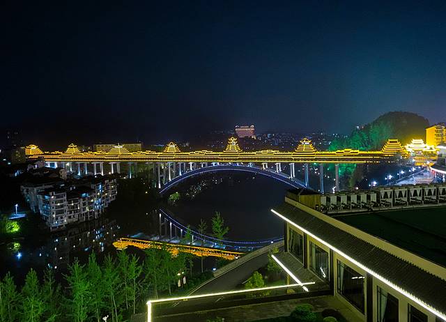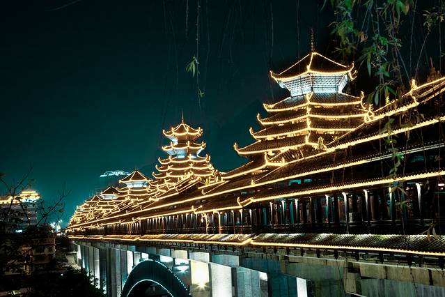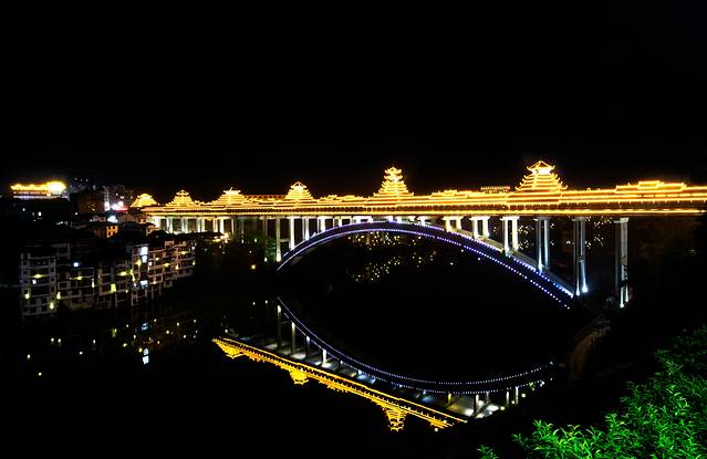风雨桥,横贯在江上,霓虹灯带让夜晚的风雨桥越加的美丽,水中倒影着桥体,如一双动人的眼睛,来到江边,更加邻近欣赏他的美,让人突然有了惊艳的感觉。风雨桥是侗族独有的桥,流行于湖南、湖北、贵州、广西等地,由桥、塔、亭组成,全用木料筑成,桥面铺板,两旁设栏杆、长凳,桥顶盖瓦,形成长廊式走道,因为行人过往能躲避风雨,故名风雨桥,尤其是三江县林溪河上的程阳桥是风雨桥的代表,据有关资料记载,程阳风雨桥与中国的石拱赵州桥、铁索泸定桥及罗马的钢梁诺娃上的沃桥齐名,为世界四座历史名桥之一,这在世界建筑史上都是一个奇迹。