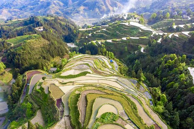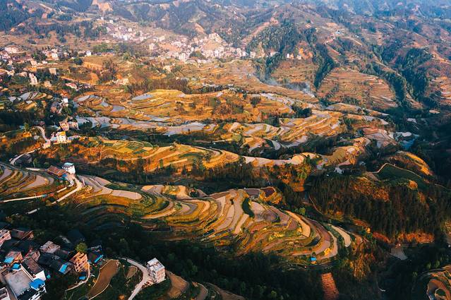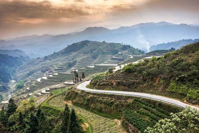 层层梯田如年轮般记录着日出而作,日落而息的耕农,夕阳染红了天际,一座座大山此起彼伏,山坳中炊烟袅袅,一幅美丽的画卷尽在眼前。