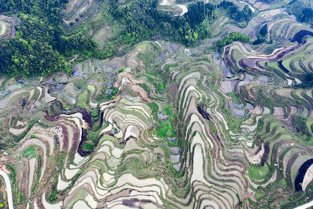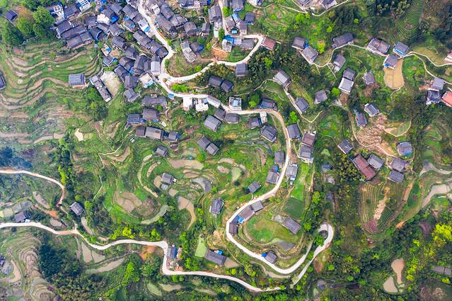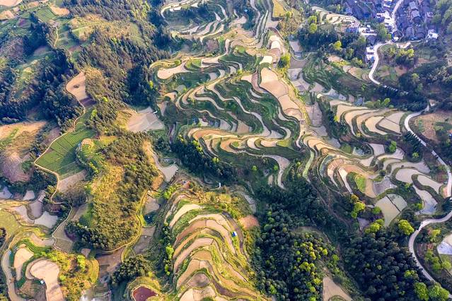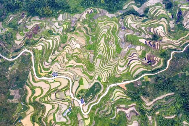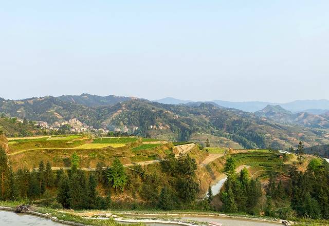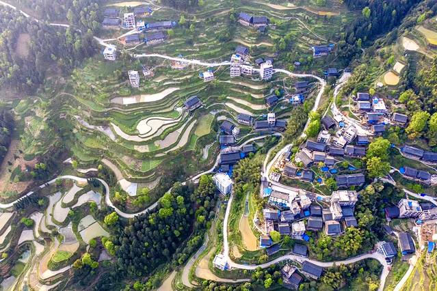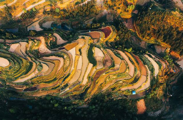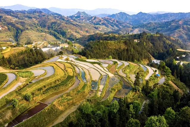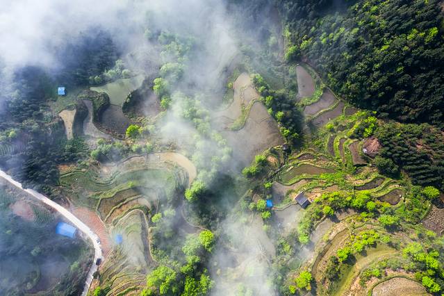 高旁村是比较好到达,翻越一座山,当汽车行驶到山岭视野一下就变得空旷了,两边梯田尽在眼前,让人一下忘记了路上的辛苦,只见层层梯田分布在山体,梯田中已经注满了水,当无人机飞上高空的那刻,一汪汪水田在阳光的直射下波光凌凌,第一次看到如此壮阔的梯田不免感到惊讶。