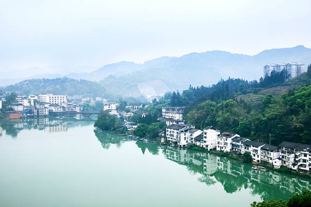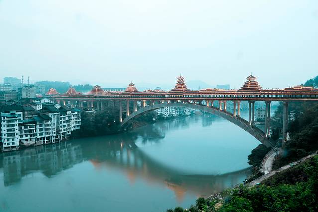 风雨桥的晨景是一种宁静,细雨蒙蒙从天空飘落,雨滴打落在水中泛起点点涟漪,打破了水中风雨桥的倒影,天青色等来了烟雨。