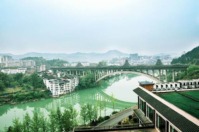 观看风雨桥比较好的位置在旁边的侗乡国宾馆,居住其中,依栏远瞭,清风送爽。