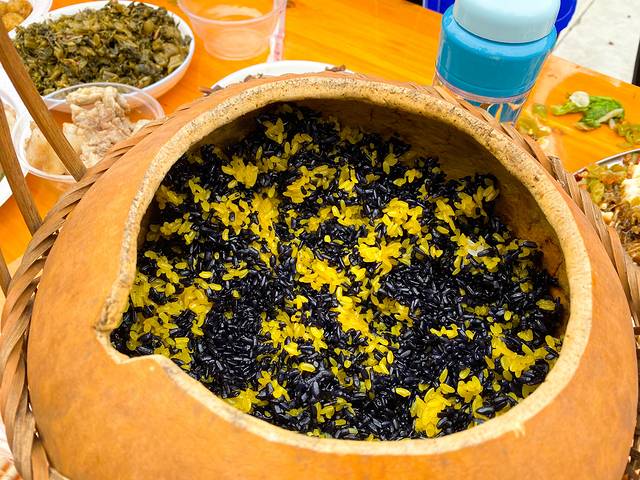 颜色艳丽的糯米饭无疑是对米饭的再升级,每一颗米粒都呈晶莹剔透,泛着油润的光泽,入口嚼劲十足;用植物给食物上色是一种古老的智慧,它既满足了一个封闭而艰苦的民族对色彩的渴望,又在客观上保护了食物天然的品质。