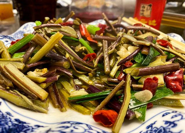 干蕨菜,蕨菜爽口滑嫩,价格也并不是很贵,将野生的蕨菜洗净晒干,切段,加之油、眼、干辣椒、蒜、蒜苗,辅之肉片的香气,构成了一道美味的农家佳肴。