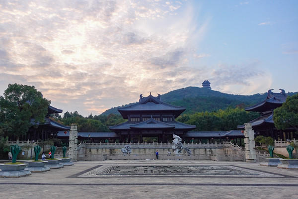 建筑外观歇山顶卷棚,飞檐翘角,亭廊楼榭皆为仿古建筑。走廊处还悬挂着大师书法名作,从中走过还能感受到浓郁的文化气息。