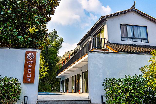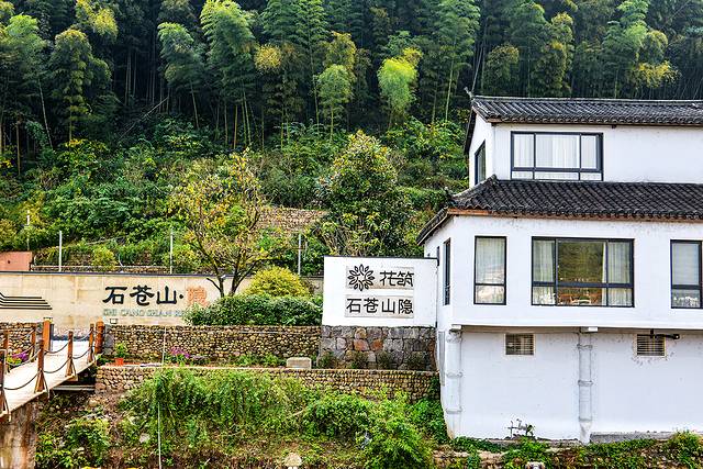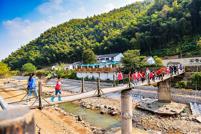 跟着导航抵达,车停好,先是看见地里一众游客挖红薯的盛况,再然后,过一座架在河上的铁索桥,对面才是石苍山隐。门前有河,背后有山,坐落在一片青山绿水之间的粉墙黛瓦,格外迷人。