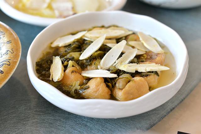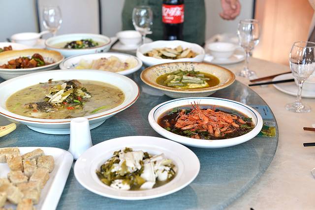 又是极具当地特色且好吃的一餐。酱油河虾,油炸响铃,臭豆腐,炖大肠,烧猪脚,炖豆付,雪菜鱼头,上汤鸡毛菜,糖醋排骨,咸肉娃娃茶,雪菜油豆腐,炸响铃,还有“蒸双臭”。