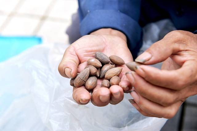 成熟的香榧采摘下来,去掉外皮,连壳一起加工炒制,就成了食用坚果中的珍品。香榧果大小跟杏仁差不多,也是剥掉硬壳后吃中间的果实,入口嘎嘣脆,越嚼越香。