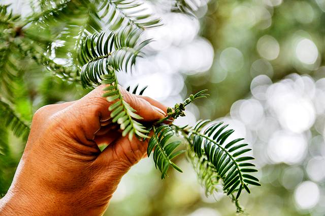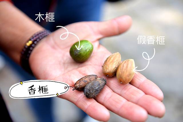 我们来迟了一个月,树上已经完全看不到成熟的香榧了。树下卖香榧果的大叔热情的给我们找了香榧花芽嫩果,香榧这个古老的树种,想要得到成熟的果实需要三年,第一年树上分化出花芽,第二年正式开花结果,第三年果子才能长大成熟,成为桌上客。大叔说,下面这个图里的香榧果明年能成。
