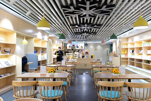 从乔波冰雪世界大门进去,左手边,一眼就能看到恋雪时光·书咖。这里是个咖啡厅,也是新华书店乔波店,里面有各种咖啡甜品,也有各种类型的图书可以选择,环境布置也是小清新范儿。
