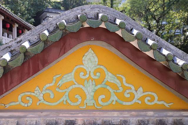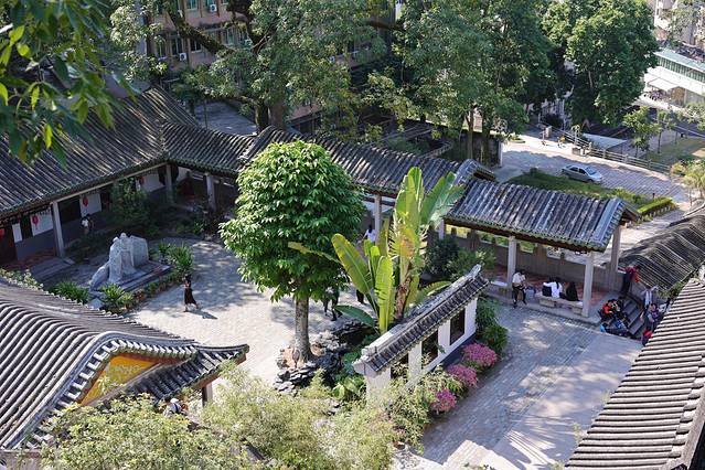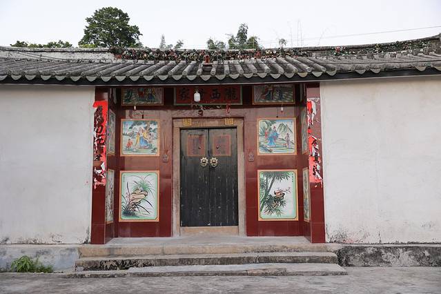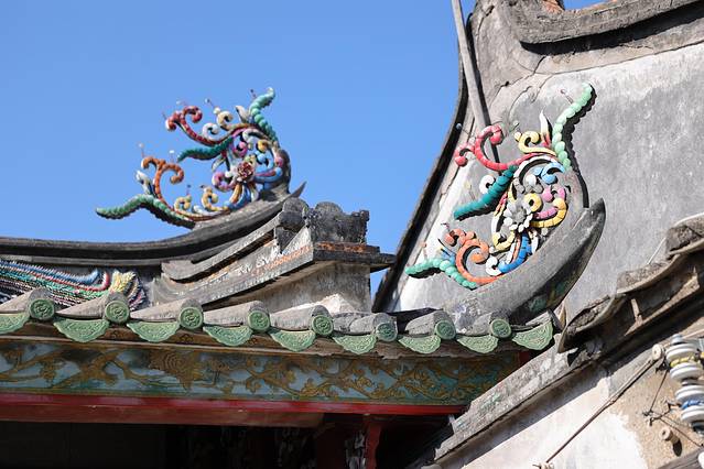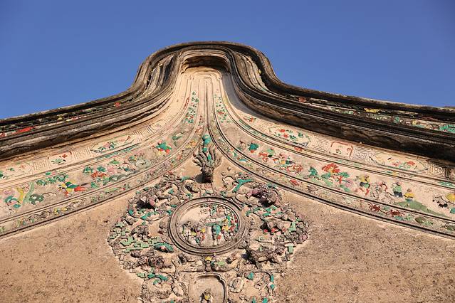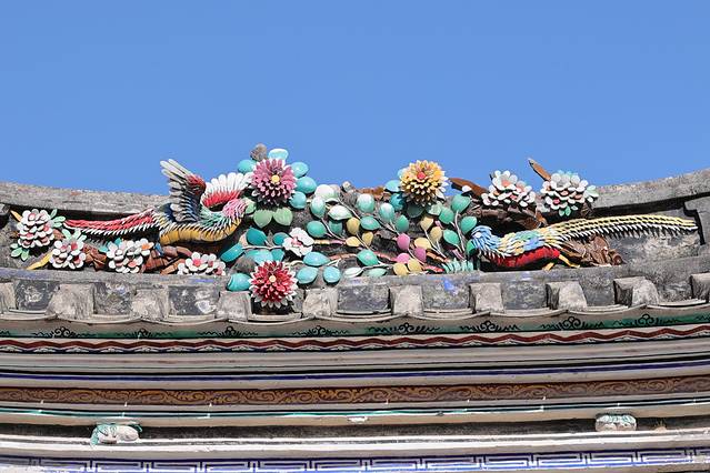 楔耳状的屋顶是岭南建筑特有的风格,一眼望去,墙上有blingbling彩色,这就是潮州著名的嵌瓷雕了。把彩色的瓷片镶嵌在建筑上,组成精美的图案。瓷片上边的彩色釉料不怕风吹雨晒,经过岁月的洗礼,它历久弥新。