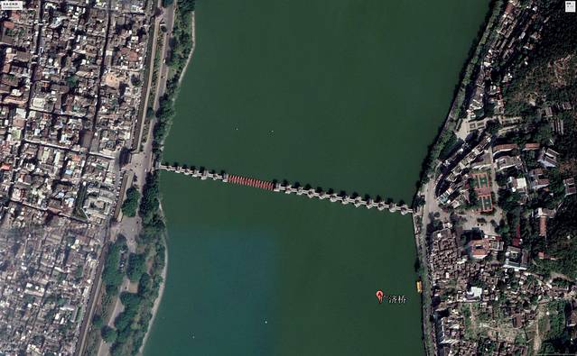 俯瞰广济桥,位于广东省潮州市古城东门外,横跨韩江,联结东西两岸,集梁桥、浮桥、拱桥于一体