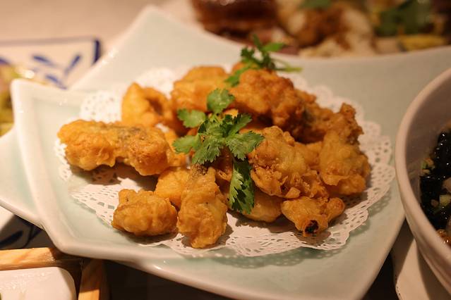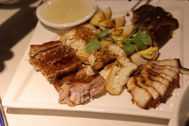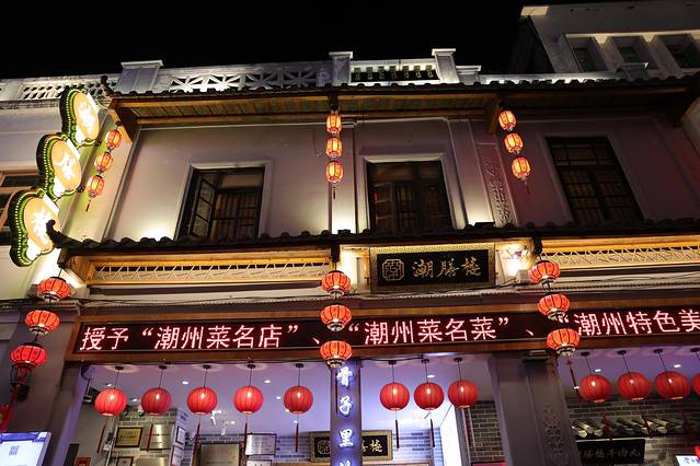 和小伙伴在潮州自驾一天,晚上已经是饥肠辘辘,把车停在广济桥附近,来到古城里的这间潮汕楼,享受我们的超性价比六人套餐:1潮州卤水拼盘、2冰镇黑椒猪肚、3鲍汁杂菇煲、4脆皮第鱼、5潮汕蚝烙、6酸菜炒牛肉、7大牛肉丸汤、8鲮鱼炒油麦菜。