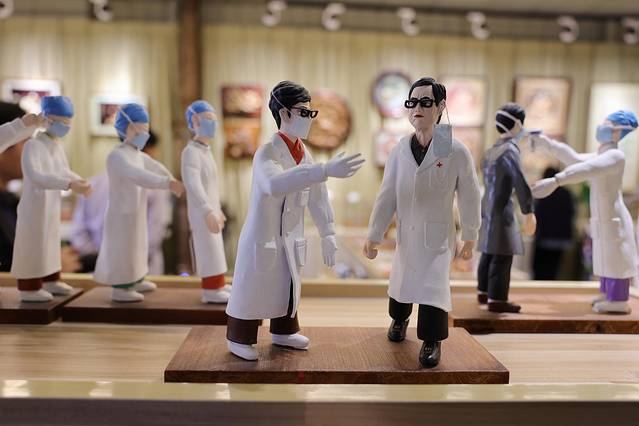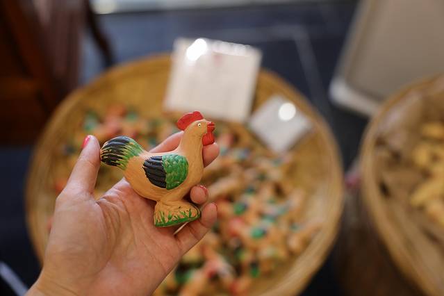 先进入的是产品展示和商品售卖区,精彩的泥塑摆满了一个个的货架,开放式的展示,可以凑得非常近来观察,第一下就被这个小小的红鸡公吸引住了,原来是一个泥塑的鸡公哨子,20块一个,小巧精致,真的可以带回家给小朋友当手信,不过出于卫生考虑,这款产品是不提供试吹的,喜欢就直接买了再吹吧。