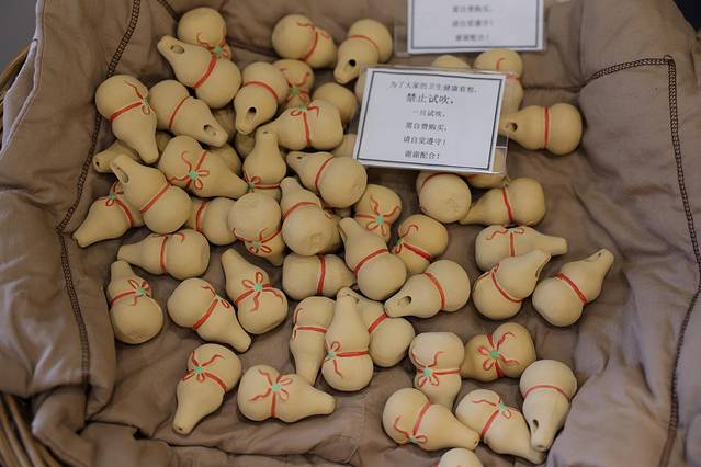 除了公鸡哨子,还有一系列的同类产品,比如桃心、葫芦、鼠、兔、猪、鱼、鸟,价格从10元到20元不等,它们是国家级非物质文化遗产项目的,潮州大吴泥塑-煌记《土叽咕》
