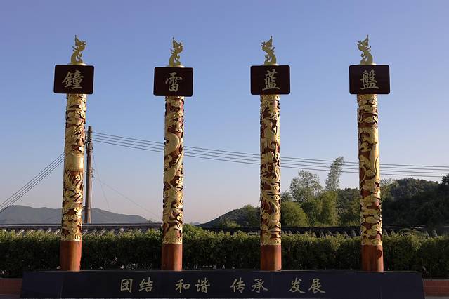 村里立了4颗金色盘龙柱,分别是四个姓氏的姓名牌,钟、雷、蓝、盘是李工坑村民的四大姓,4家都和和气气,一起建设李工坑畲族村。