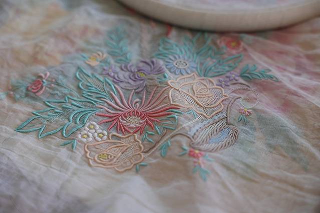 近看细节,潮绣富有立体感和层次感,利用堆积的手法让花朵更立体,用不同颜色的丝线营造花朵的渐变效果。