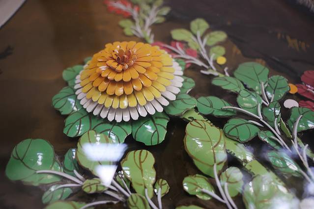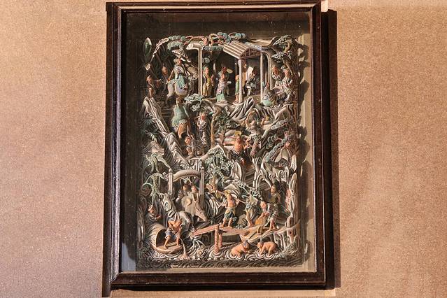 嵌瓷常见于屋脊墙壁,太高了,视线太远了,总看不够。只有在嵌瓷博物馆,才可以这么近距离的观察每一朵嵌瓷雕花的细节,一朵菊花的立体的呈现,花瓣层层堆叠非常立体。