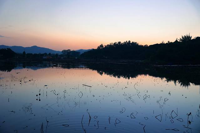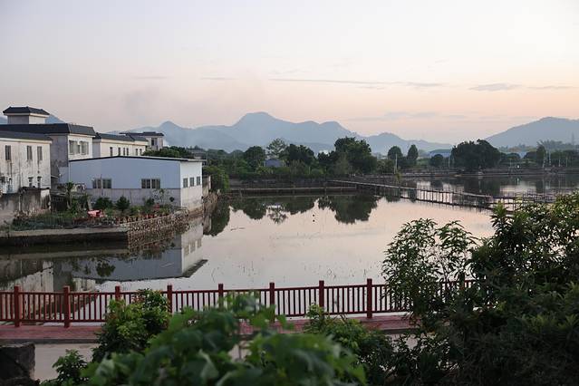 伴随着一抹红艳艳的晚霞,我们自驾游来到了狮峰村,一进村口,就被一个大大的水塘吸引了,水如镜面,把附近的房子、树木、山峰,都倒映衬在水中,此情此景格外美丽,原来它就叫做白鹭湖。穿过白鹭湖,去村中闲逛,村子里有大大的篮球场,房子都有着鲜明的潮州特色,白墙黑瓦,门口贴着吉祥如意的瓷砖画,笔直的屋脊都有漂亮的嵌瓷雕,牡丹、凤凰、狮子、莲花,题材很丰富。