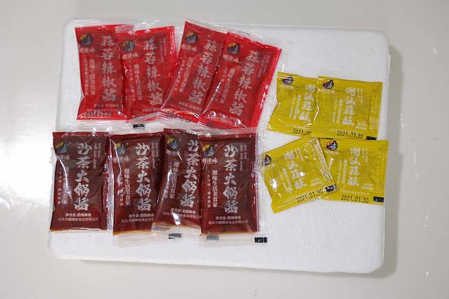 工厂搭配的酱料有:蒜蓉辣椒酱、沙茶火锅酱、潮汕蒜酥