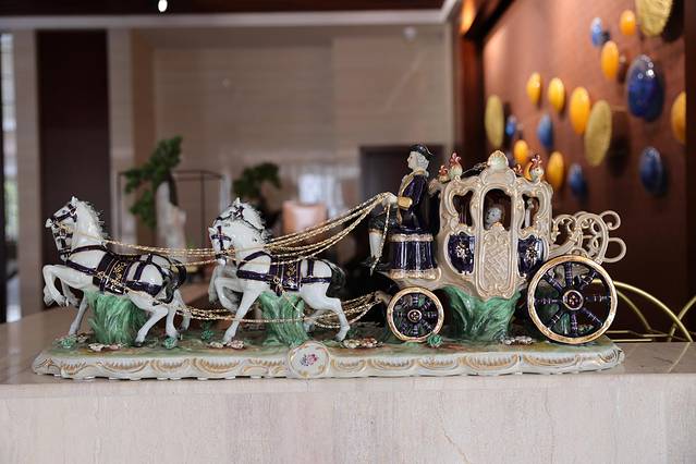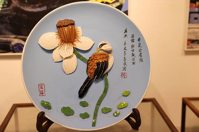 我太喜欢嵌瓷艺术作品了,五颜六色,在阳光下闪着釉光,不怕日晒雨淋,精雕细琢的嵌瓷艺术品,真的可以永流传。它采用的材料,来自于瓷器烧制的报废或残次品,把废物再利用,变成精美的艺术,多好呀!在潮州有很多嵌瓷建筑,都在屋脊上,高高的只能仰望,来到潮州嵌瓷博物馆,终于可以近距离的观察这些嵌瓷了,看用各种瓷片拼凑的花鸟鱼虫人物,超级精美,满足了我对嵌瓷的各种期许