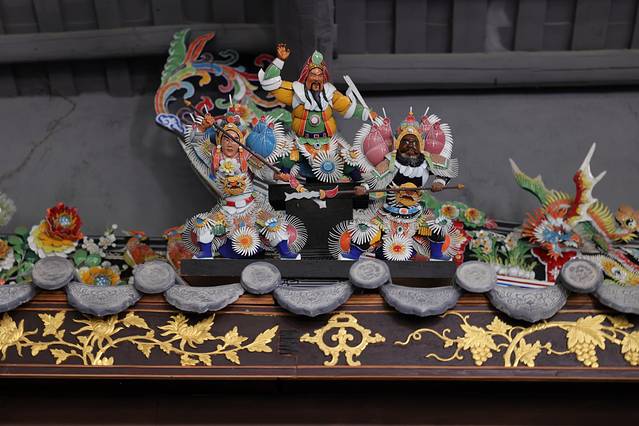 潮州嵌瓷雕有多厉害呢?在屋脊上拼出来的小小的人像,我都一眼看出来了,桃园结义三兄弟,每一个人物都惟妙惟肖。不用画笔,胜似画笔。