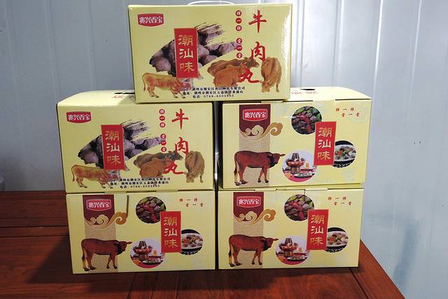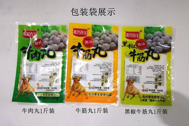 兆兴香宝”牛肉丸均采用纯牛肉制作,不掺杂,无添加防腐剂,力求表里如一,且独具牛肉之气味,符合感官要求。2019年荣获第二届潮州十大手信(食品类)称号。2020年荣获第二届潮安十大国潮称号。这里有三种口味的牛肉丸,一斤装的牛肉丸、一斤装的牛筋丸、一斤装的黑椒牛筋丸。