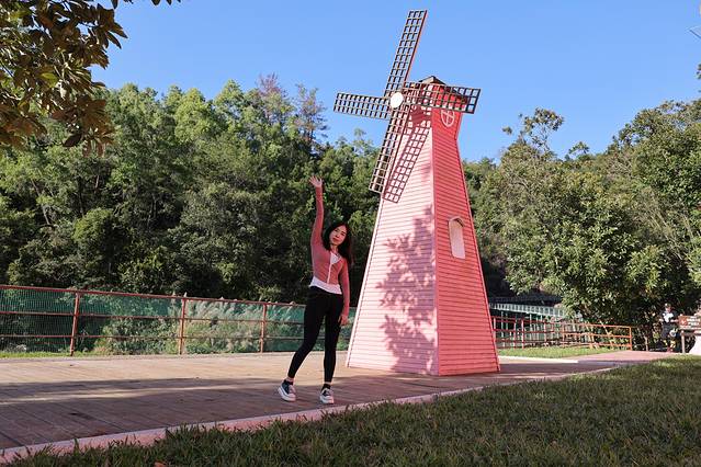 蓝天映衬下的粉红风车,可以打卡拍个人像照哦。