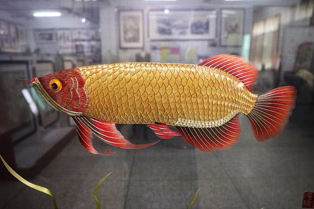 这条金龙鱼居然是绣出来的,基底是一张网纱布,鱼身由金线绣成,鱼鳍主色是红色,还用了特别多的过渡色丝线,这条鱼是立体状的,因为在鱼身里塞入了棉花,这是潮绣里的立体绣绣法,另外这条鱼的两面都是正面,这是双面立体绣,难能珍贵。