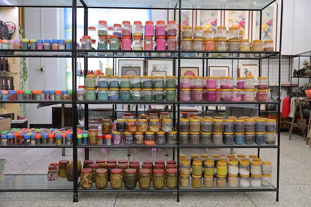 我看到有一个大大的架子,上面摆上了各种瓶瓶罐罐,瓶瓶罐罐里装的是什么?各种大小颜色的珠子和不同形状的亮片,小的只能用牙签盒装,有了这么多精彩的辅料配件,潮绣珠绣有了超级多的发挥空间。