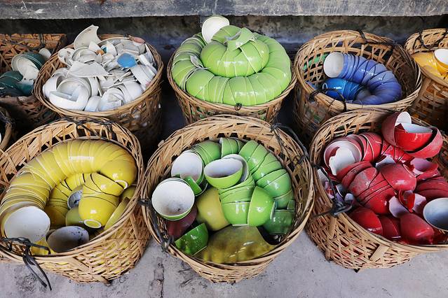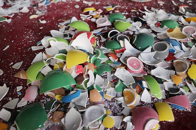这些个五颜六色的瓷碗碎片,是嵌瓷雕创作最合适的材料。