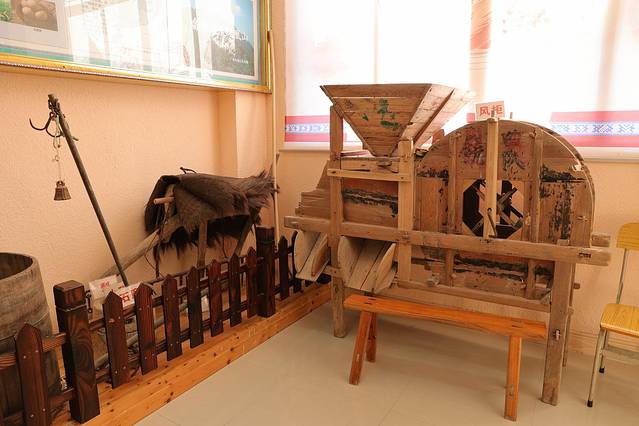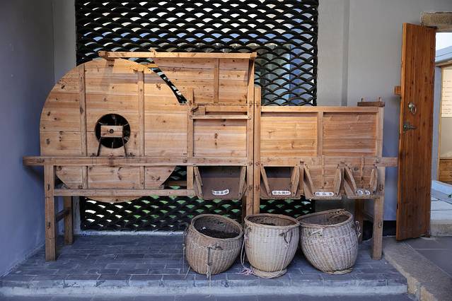 这是一台风车,以前是常用来筛选分离稻谷和谷壳,原来潮州制茶也用风车,它是用来分离不同质量的茶叶。