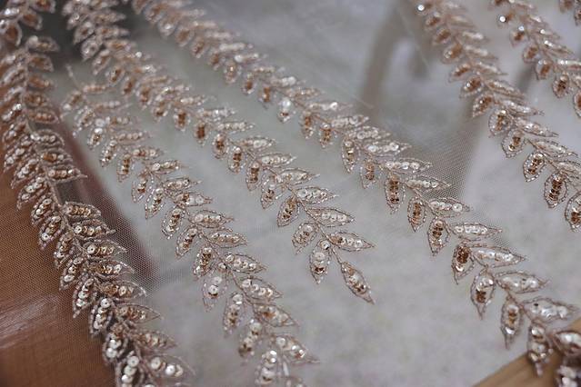 在透明的网纱布上面,手工绣上亮片和珠子,组成了绚烂的的银色树叶,这种刺绣针法常见在晚礼服上,穿出来光彩照人,只有重工的手工礼服才用得上潮绣的技法吧。