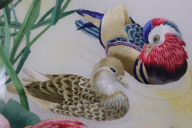 馆内的潮绣作品众多,远看像一幅画,近看才发现密密麻麻的一针一线,只有局部的特写才能看清每一针的走法,每一针都在指定的角度,在绣线的颜色采用上,也能看出非常的严谨,比画画更严谨。
