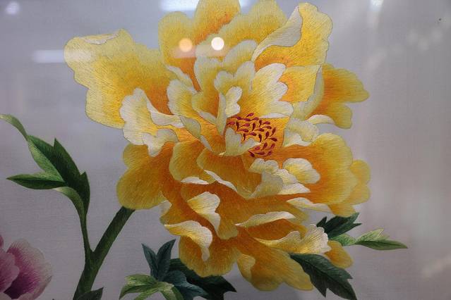 看这幅牡丹图其中的一朵牡丹,细细的针脚密密麻麻,一朵黄色的牡丹不知用了多少种色线,精工制造真是太妙了,不知道花了匠人多少时间,才有了这么出色的作品,我已经佩服得五体投地了!