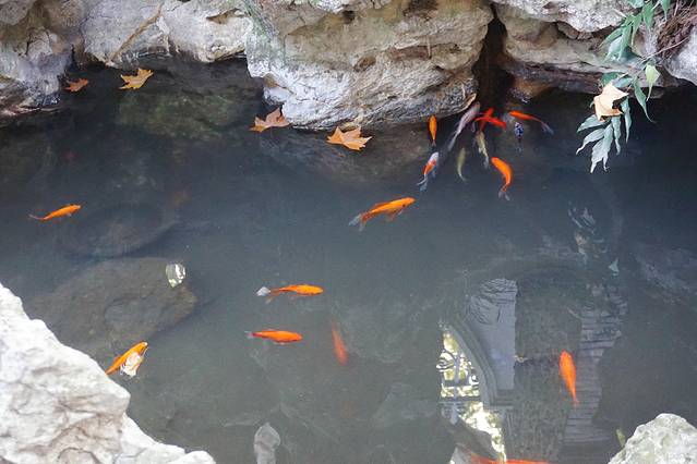 最爱鱼池,这里假山造景鱼池,秋天的枫叶飘落,更添一份秋意闲情。