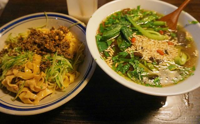 面的价格有点贵,全素的面,两碗面加一杯酒酿饮品要100块钱。性价比实在不算高,但是这两个素面还算好吃。
