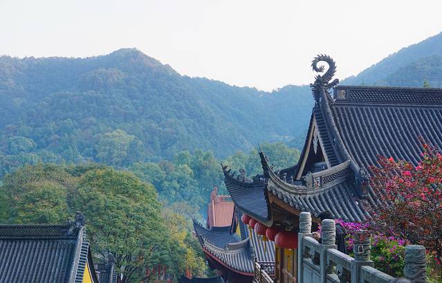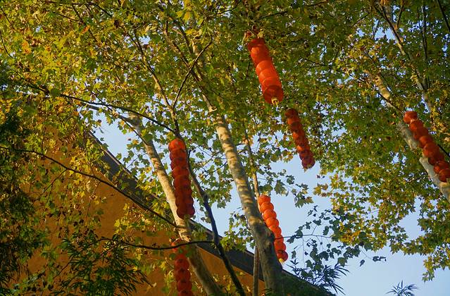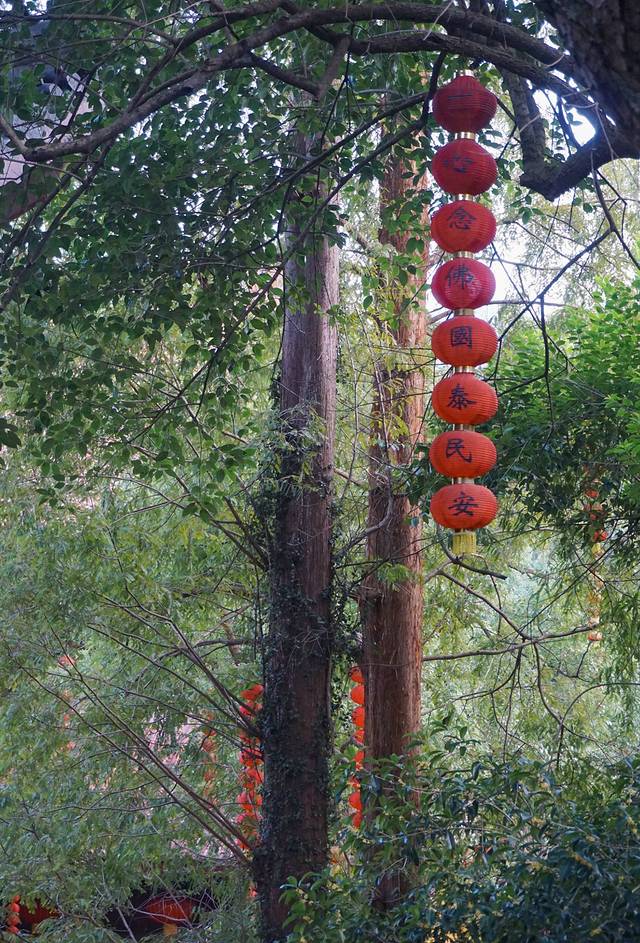 有一首歌叫《秋天的碧岩寺》,是电影《听说》里的BGM,极为好听,我看着这蓝天,秋天的阳光,黄色的庙宇,青绿的树叶上挂着红彤彤的灯笼一串串,极为好看,就想起这首歌。
