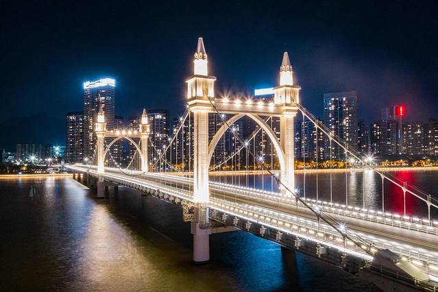 在河岸附近的餐厅用过晚餐后,夜幕降临,白石桥的华灯点缀了整个夜晚,空气里弥漫着欧式的浪漫,英伦塔尖的梦幻感将我们带到大洋彼岸。走上白石桥,让人着迷的光影与深蓝的天空交相辉映,放眼望去,前山城的繁华尽收眼底。随着一天流逝,街道逐渐平静,我们也将珠海前山揽入记忆。
