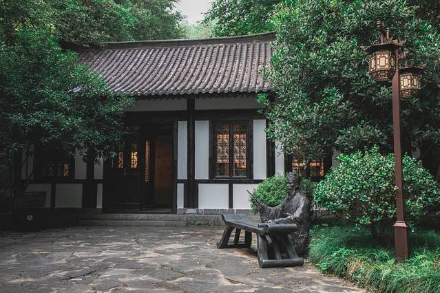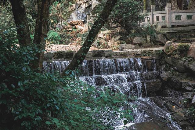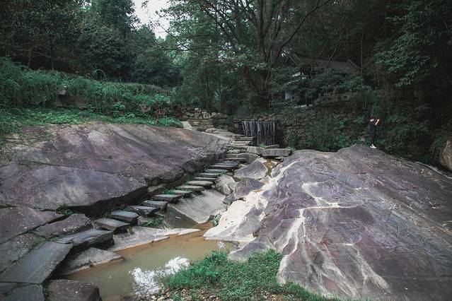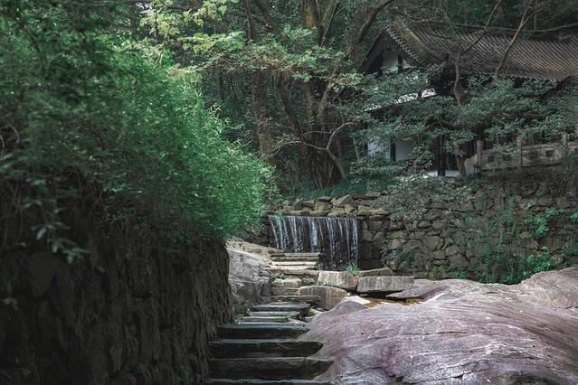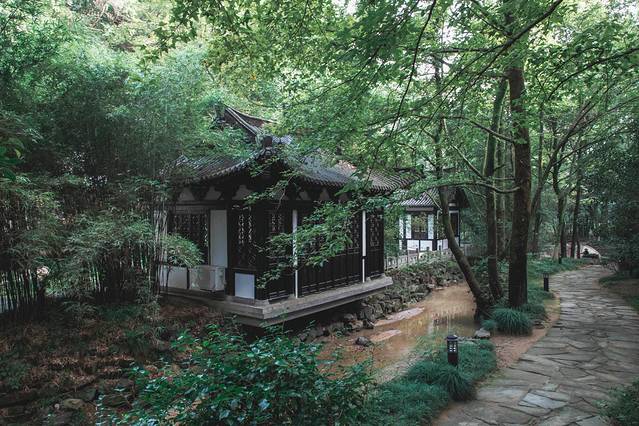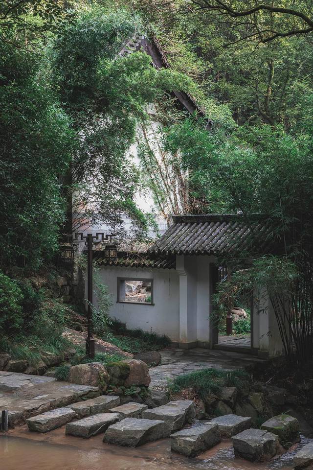 山谷流泉是一座浑然天成的艺术博物馆,见证着历朝历代的石刻艺术,除了摩崖石刻这里更像是一个休闲度假的清幽圣地,中式建筑的庭院掩藏在茂密的林荫中,迈过溪流上的石阶慢慢走向山谷流泉的深处,一处白墙青瓦的中式庭院出现在眼前,所营造优雅的意境,让人倍感惬意。