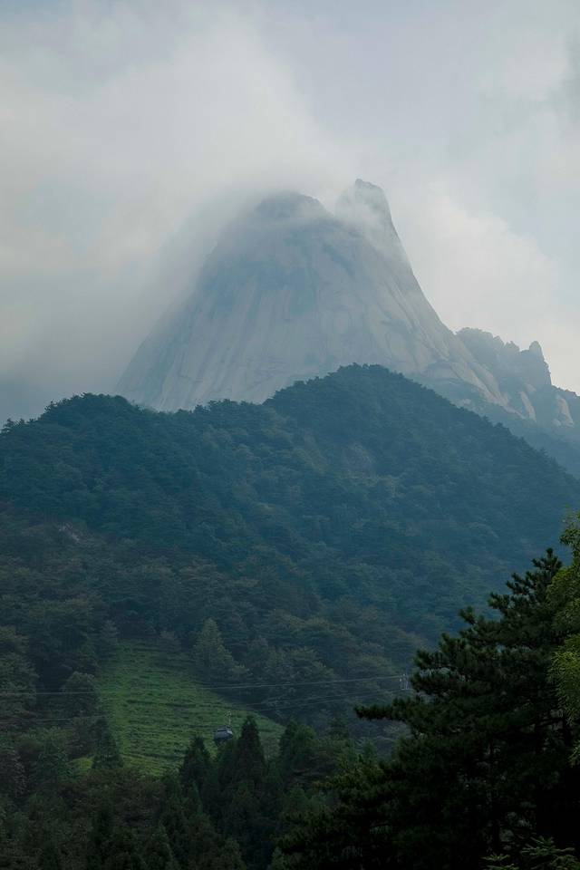 行走在 天柱 山的石阶上,看着眼前被云雾所围绕的山峰,朦胧缥缈山峦含翠,雾气时而翻过座座山峰,时而从山谷间涌起升腾,我不知雾气何时会来何时会散,也不知道下一个转弯会遇到怎样的美景,云雾中的 天柱 山若隐若现好似梦幻仙境。